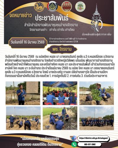 สำนักงานพัฒนาชุมชนอำเภอไทรงาม โดยสิบตำรวจโทหญิงวิลัยพร เปรมอ่อน พัฒนาการอำเภอไทรงามพร้อมด้วยเจ้าหน้าที่พัฒนาชุมชน และเครือข่ายโคก หนอง นา เเละประชาชนในพื้นที่ เข้าร่วมกิจกรรมเอามื้อสามัคคี โคก หนอง นา ระดับอำเภอ ประจำเดือนมีนาคม 2569 ณ แปลง โคก หนอง นา ของนายเอกนรินทร์ คูคลัง ม.3 ต.หนองไม้กอง อ.ไทรงาม โดยมี นายประเสริฐ รานอก ปลัดอำเภออาวุโส เป็นประธานเปิดฯ กิจกรรมเอามื้อสามัคคีในวันนี้ ประกอบด้วย